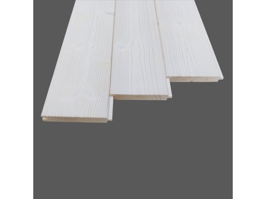 Čtyřstranně opracované obkladové palubky z jehličnatého dřeva o síle 19 mm a šířce 121 mm. Povrchová úprava kartáčované, strojně barveno na bílo. (19x121x4200)